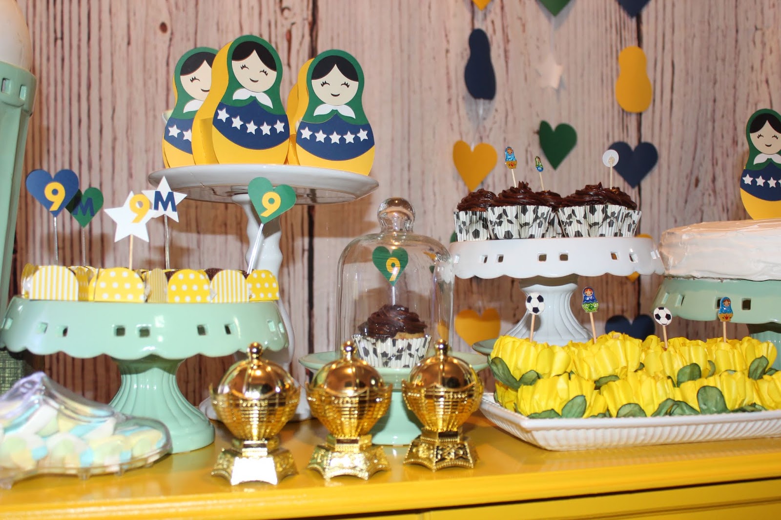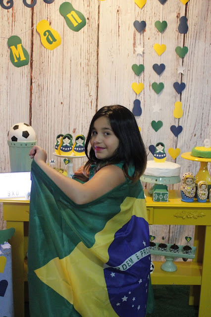 Foi em clima de copa que comemoramos o nono aninho da Manu. E, sim, esse tema pode ser muito feminino, principalmente contando com o brilho das famosas e fofas Matrioskas, que ganharam roupas das cores do Brasil!